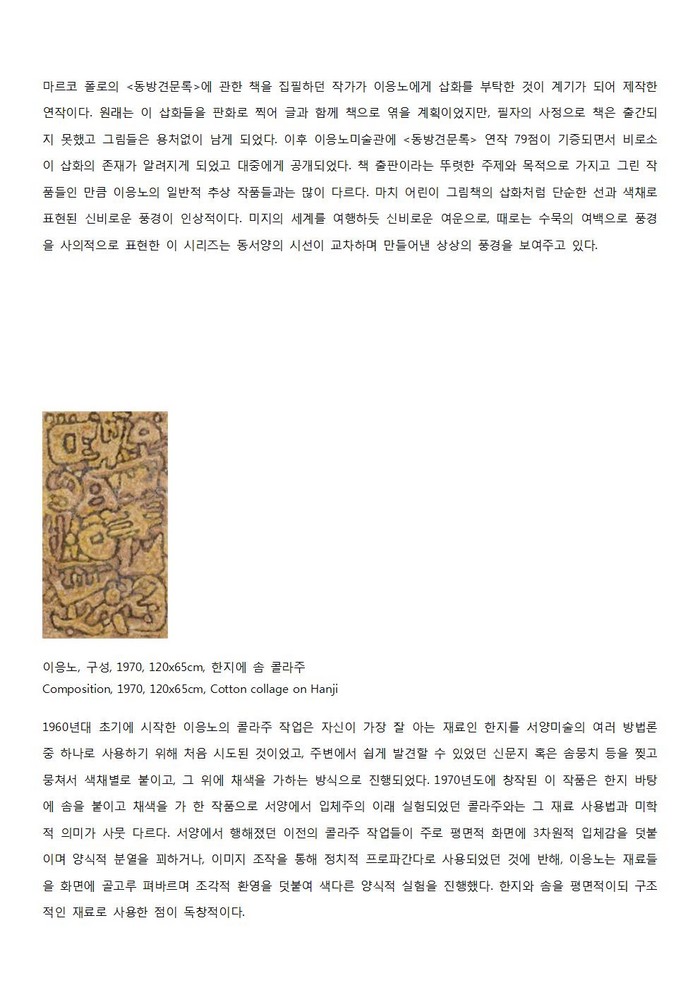 ○ 주역 연작, 마르코 폴로의 <동방견문록> 연작도 이응노가 남긴 작품의 다양성과 압도적 상상력을 짐작케 하는 대작이다. 또한 이번 소장품 전은 다양한 군상 작품을 통해 군상 연작의 양식적 근원이 서체에 있음 확인해 볼 수 있는 기회가 될 것이다.