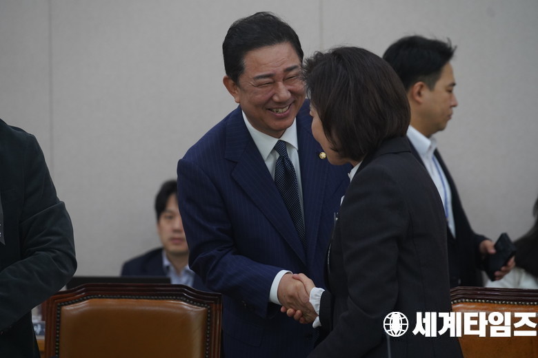 '김병기' 더불어민주당 원내대표가 24일 오전 서울 여의도 국회 법제사법위원회에서 열린 법제처에 대한 국정감사에서 '나경원' 국민의힘 의원과 인사를 나누고 있다.