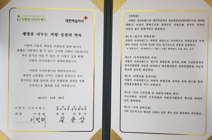 사랑의 사다리 밴드는 매년 지속적으로 동,하절기에 2회씩 헌혈 나눔 봉사를 하기로 약정을 체결하였으며 2018년 1월19일 금요일 오전 9시~오후6시에 대한적십자사 대전세종충남혈액원에서 첫 번째 헌혈 나눔 봉사를 하기로 하였다.