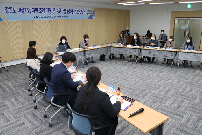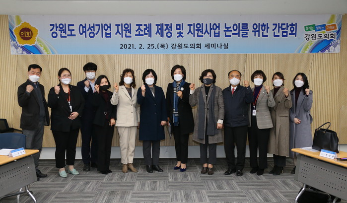 2월 25일(목) 14:00 강원도의회 세미나실에서 강원도 여성의 기업활동과 창업을 지원하여 여성의 경제활동 촉진과 여성기업인 지위향상을 통하여 지역경제 발전을 도모하고자 간담회를 개최하였다.