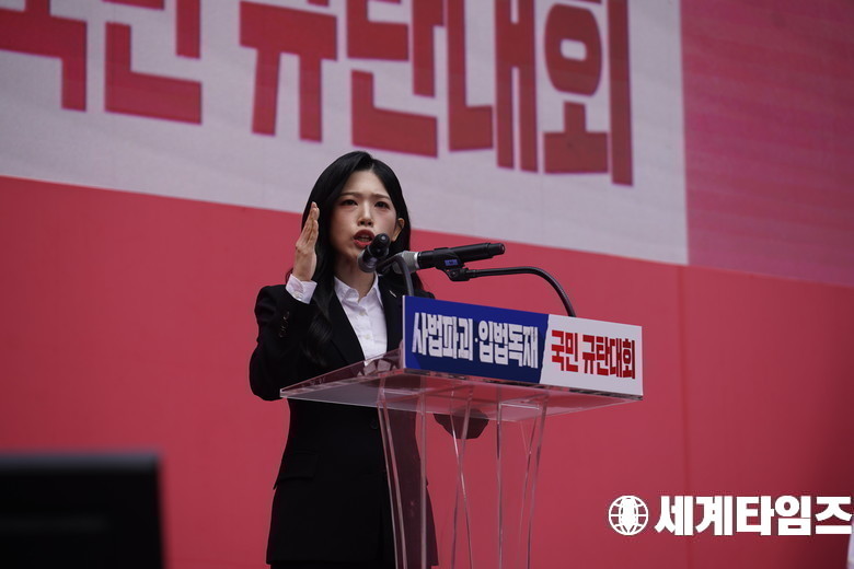 '백지원' 전 제21대 대선 중앙선대위 대변인이 28일 오후 서울 중구 시청역 인근에서 열린 사법파괴·입법독재 국민 규탄대회에서 규탄사를 하고 있다.