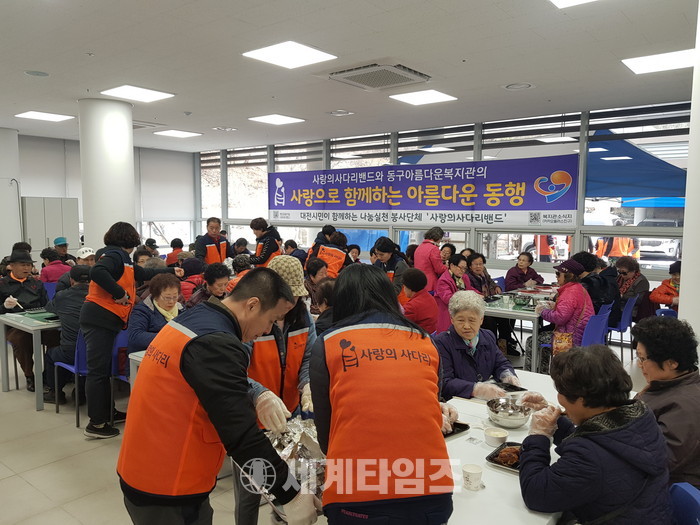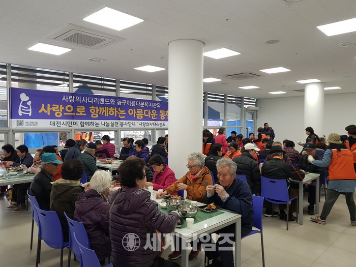 [대전=세계타임즈 이장성 기자] 다양한 봉사를 하고 있는 SNS 6천명 봉사단체 사랑의 사다리 밴드(리더 이정제)는 7일 오후2시 동구 아름다운복지관(관정 최재천)에서 동구지체장애인협회 250명의 회원들에게 바비큐통닭 봉사로 우리 사회의 따뜻한 정을 나누었다