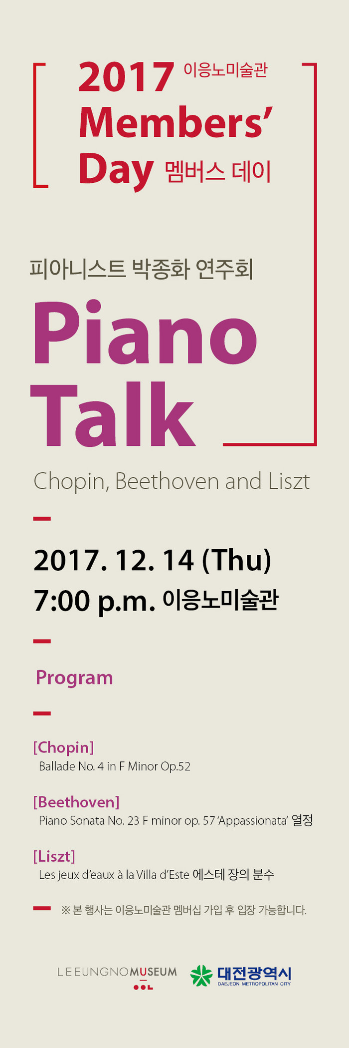 이번 공연은 미술관 멤버십 회원들을 위한 멤버스데이(Members’Day) 행사로, 클래식 거장 베토벤, 쇼팽, 리스트의 곡이 피아니스트 박종화의 손으로 연주된다.