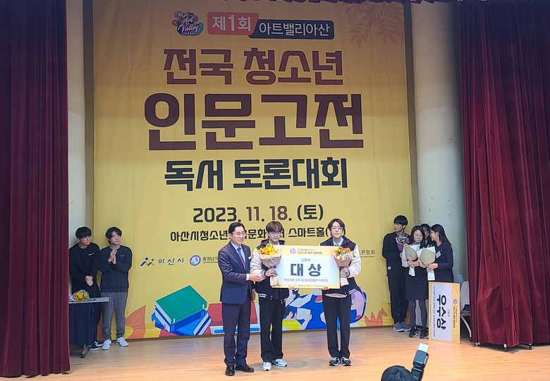 [아산시 세계타임즈=백택기 기자] 이순신고등학교(교장 김태균) 1학년 이강 학생과 홍지후 학생팀이 [제1회 아트밸리 아산 전국 청소년 인문고전 독서 토론대회]에서 대상을 받았다.