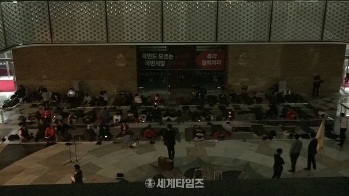 | ▲ 국회 로텐더홀에서 긴급 의원총회를 마친 자유한국당 의원들이 담요를 덮고 취침을 하고 있다. |