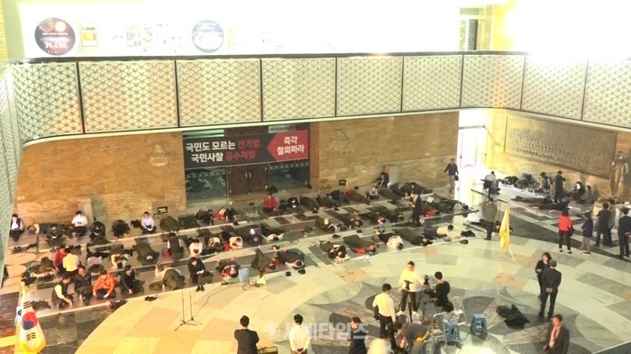 | ▲ 국회 로텐더홀에서 철야 농성중인 자유한국당 의원들 |