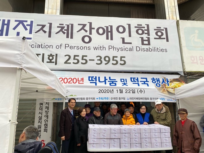 중구지체장애인협회 김채린 회장은 “ 오늘 2020년 떡나눔 및 떡국 행사에서 사랑의 사다리 밴드에서 떡국 급식봉사와 통닭을 지원해주어서 큰힘과 위안이 된다.”면서 감사함을 전했다.