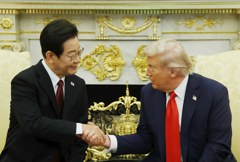 [세계타임즈 = 이채봉 기자] 이재명 대통령과 도널드 트럼프 미국 대통령이 25일(현지시간) 미국 워싱턴DC 백악관에서 정상회담을 하며 악수하고 있다. 2025.8.26