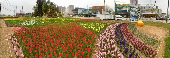 지난해 11월 포천의 추운 겨울을 견딜 수 있는 튤립 구근을 골라 꽃묘 식재 비용의 10분의 1로 조성하였고, 올봄 개화를 시작하여 상춘객의 발길을 모으고 있다.