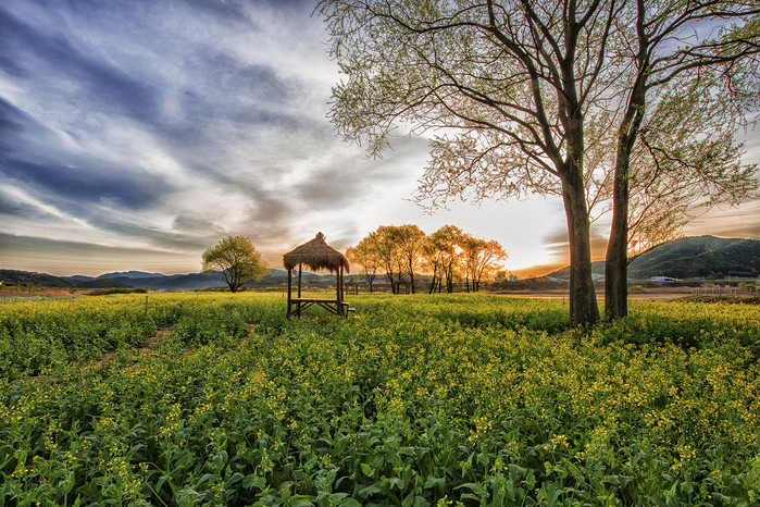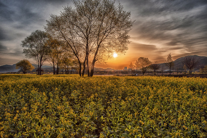 지난가을 합천군 농업기술센터에서 황강변에 뿌린유채가 활짝 피었다. 혹독한 추위 이겨낸 유채 꽃 송이마다 일출빛 스며들어 황금빛으로 가득하다.
