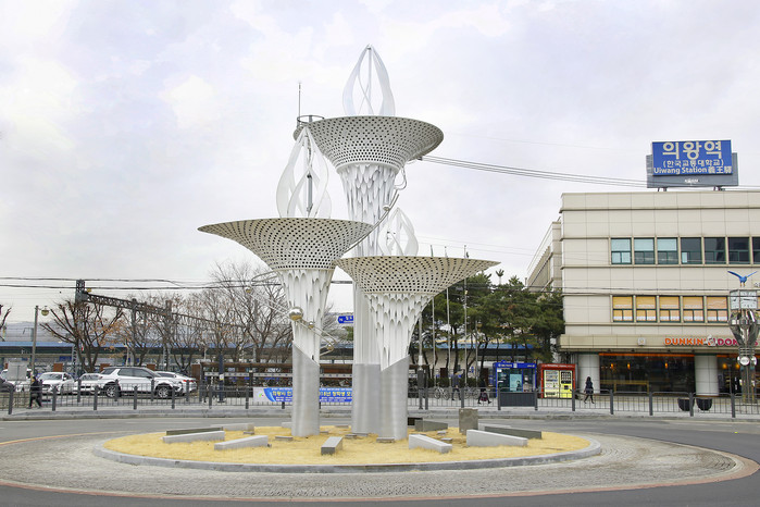 [의왕시=세계타임즈 이영진 기자] 의왕역 앞에 철도특구를 상징하는 조형물인 ‘레일타워’가 아름다운 조형미를 뽐내고 있다. 지난해 5월 설치된 레일타워는 '행복한 시간으로 떠나는 기차여행'이란 주제로 높이 8.5m와 6m 두 개의 조형물로 만들어 졌으며, 지난 2월 높이 11m의 조형물 1점을 추가 설치해 상징성과 완성도를 높였다.