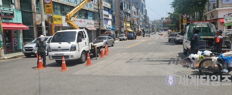 | ▲ 위 사진을 촬영하고 지나치자 그냥 작업 도중 재 촬영하는 것을 확인하고 부랴부랴 안전고깔 배치 |