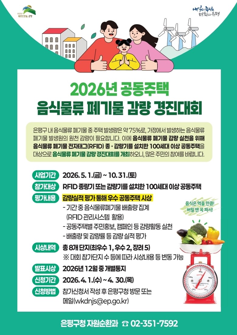 김미경 은평구청장은 “이번 경진대회를 통해 공동주택 중심의 자발적 감량 체계를 강화하고, 폐기물 발생량 감소와 처리비용 절감, 환경보호 효과를 거둘 수 있기를 바란다”며 “주민들의 적극적인 참여로 생활 속 감량 문화가 확산되기를 기대한다”고 말했다.