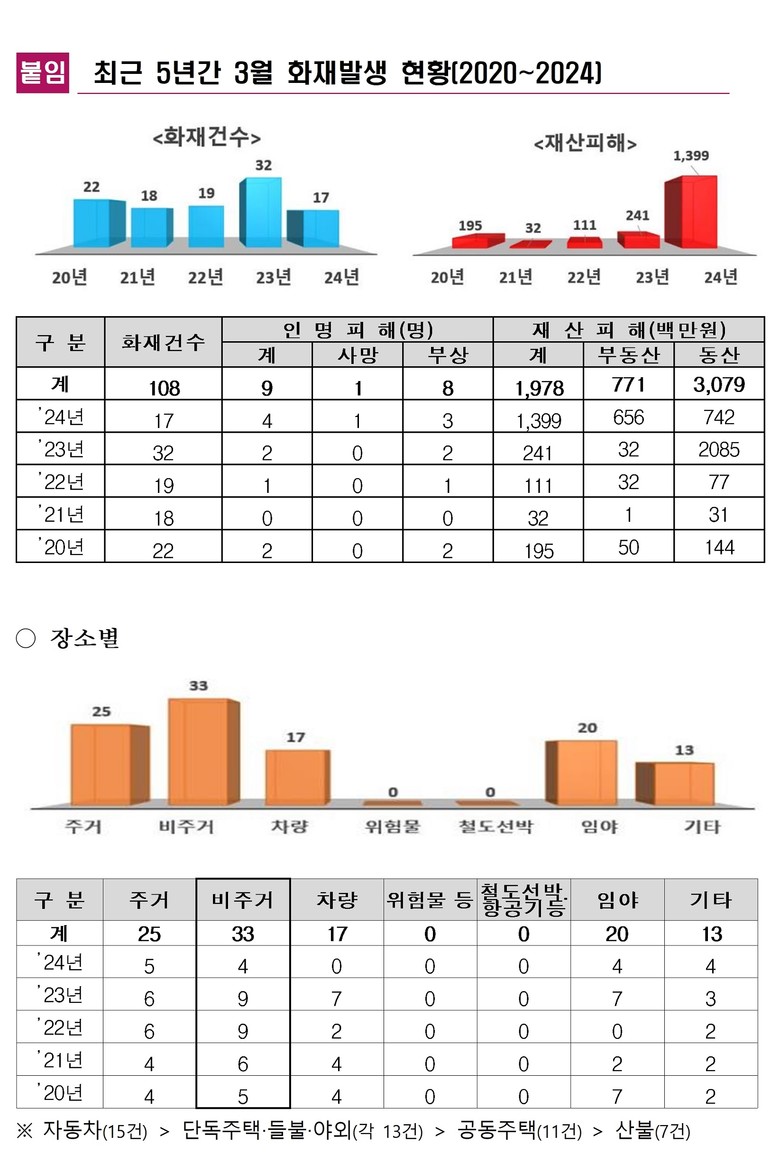 3월 화재 발생 장소는 비주거시설이 33건으로 가장 많았고 주거시설 25건, 자동차 15건, 단독주택과 들불 및 야외 화재가 각각 13건으로 집계됐다.