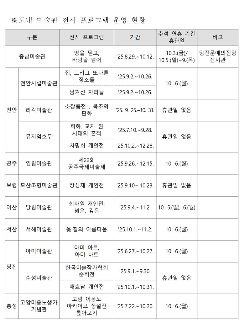 충남미술주간은 이번 추석 연휴 기간에도 계속 운영되며, 미술관별 특별 전시 프로그램도 마련돼 있다.