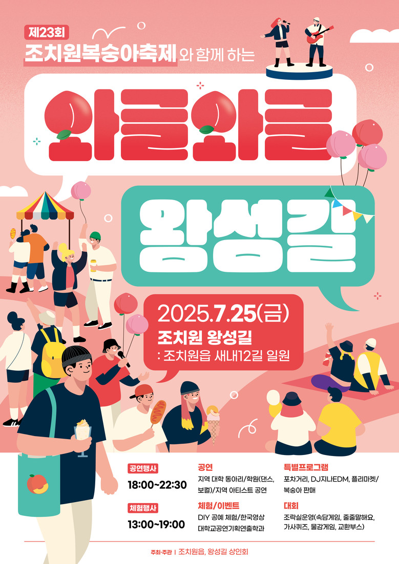 축제에서는 ▲지역 동호회·대학생 동아리 공연 ▲조치원복숭아 판매부스 ▲조치원 오락실 체험(공예 만들기·게임) ▲왕성길 야시장 포장마차 ▲전문 디제이(DJ) 파티 등 각양각색의 프로그램을 진행한다.