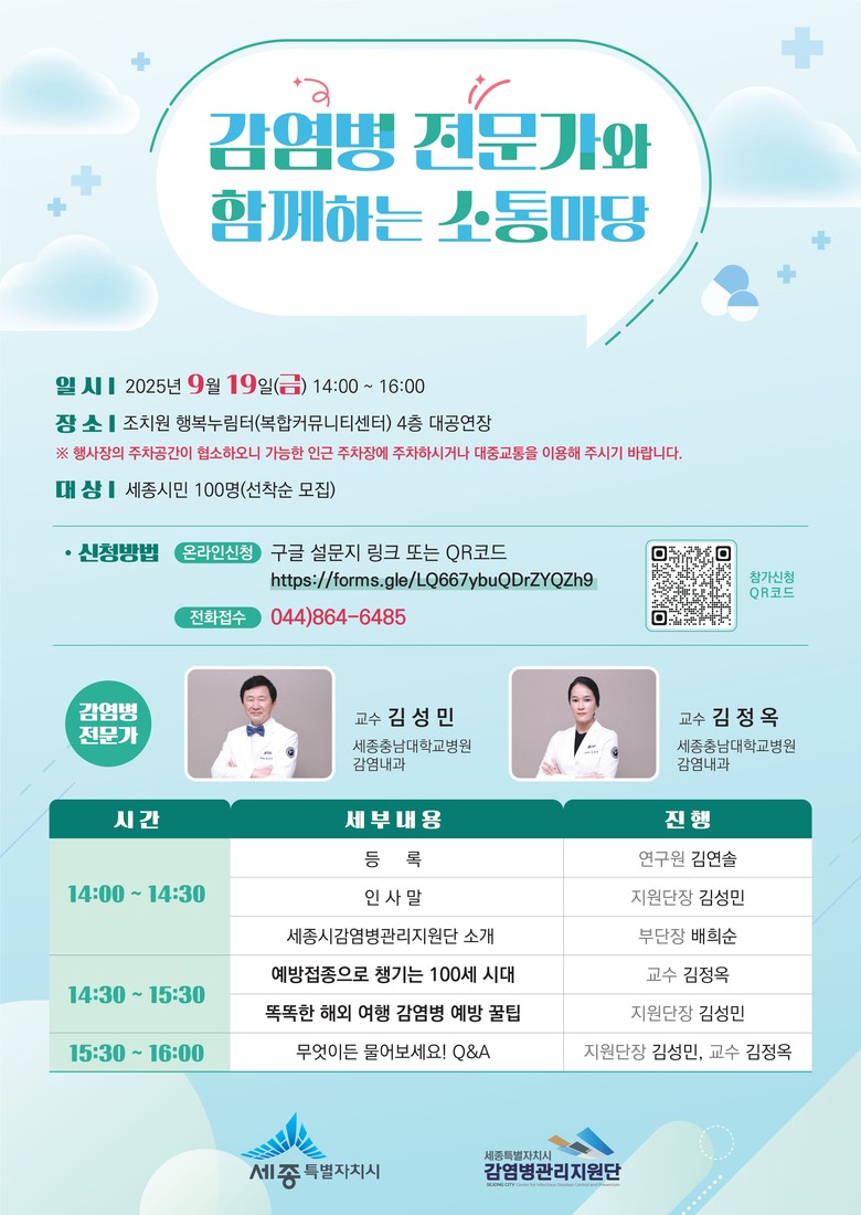 참가 희망자는 온라인(https://forms.gls/LQ667ybuQDrZYQZh9)으로 신청하거나 감염병관리지원단에 전화(☎044-864-6485)로 신청하면 된다.
