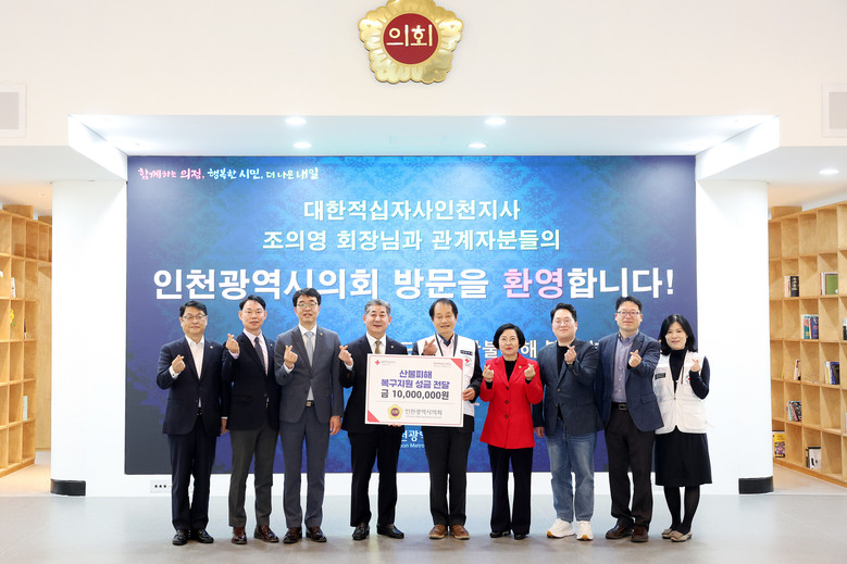 그는 또 “인간의 힘으로 통제할 수 없는 재난은 본질적으로 사회적 문제”라며 “재난 앞에 지역 간 경계는 존재하지 않는다는 생각으로 인천시의회가 마음을 모았고, 피해 주민들이 일상을 회복하고 지역 사회를 재건하는 데 이 성금이 작은 보탬이 되길 바란다”고 덧붙였다.