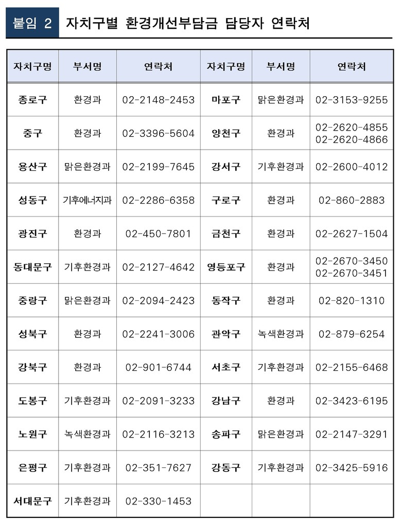 주소지 변경으로 관할 자치구가 변경된 경우, 전입한 자치구에 다시 일시 납부 신고를 해야 한다. 환경개선부담금은 후납제 성격으로 반기마다 부과되기 때문에 1월 1일 이후 자동차 소유권을 취득한 경우, 당해 연도에는 연납 대상이 아니다.