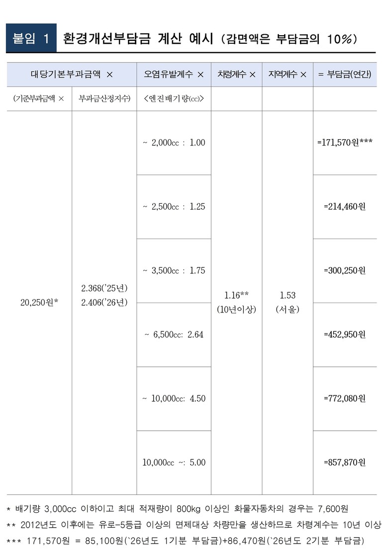 [서울 세계타임즈=이장성 기자] 서울시가 노후 경유차량 소유자에게 부과하는 자동차 환경개선부담금을 1월16일~2월 2일 내 일시 납부(연납)시 부과금액의 10%를 감면해 준다. 연납분 제도 활용시 최소 1만 7천 원에서 최대 8만 6천 원까지 감면 받을 수 있다.