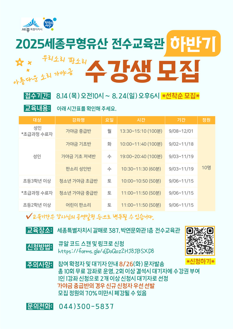 - 8월 25일~27일 가야금 전공자 대상 전문교육 수강생 모집도 - [세종 세계타임즈=이채봉 기자] 세종특별자치시(시장 최민호)가 14일부터 오는 24일까지 ‘2025년 세종 무형유산 전수교육관 하반기 강좌’ 수강생을 모집한다고 밝혔다.