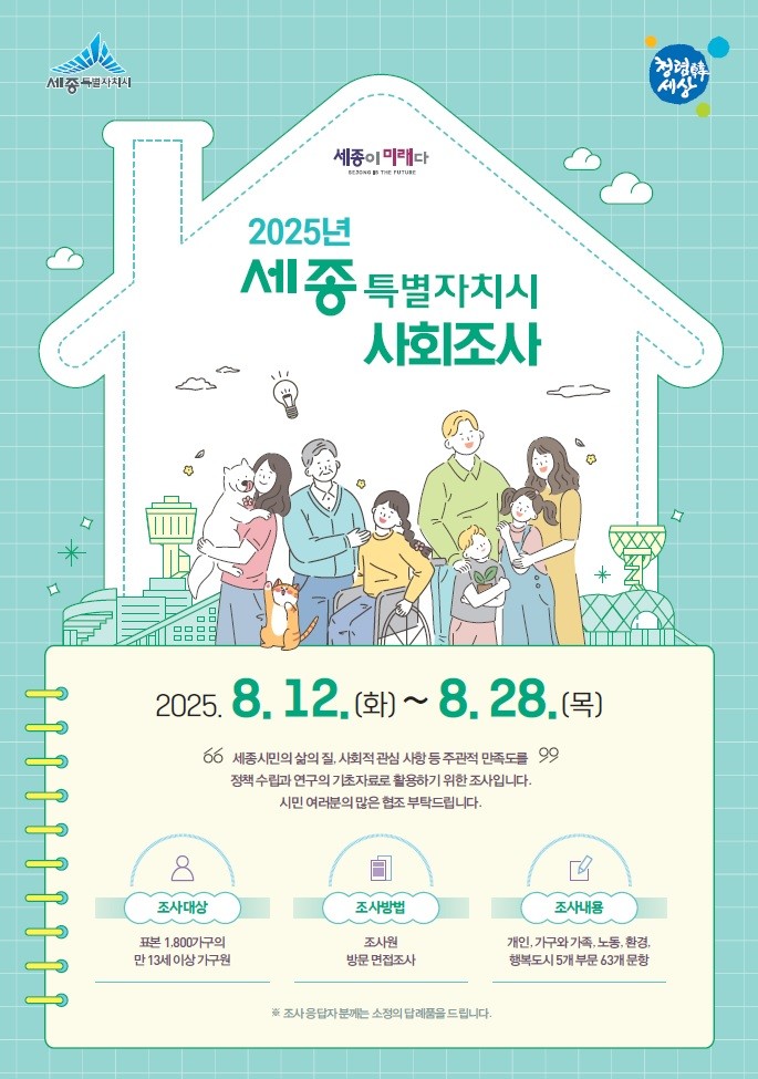 사회조사는 지난 2014년부터 매년 실시하고 있으며, 세종시민의 삶의 질, 사회적 관심사항 등에 관한 주관적 만족도를 조사해 정책수립과 연구 기초자료로 활용하고 있다.