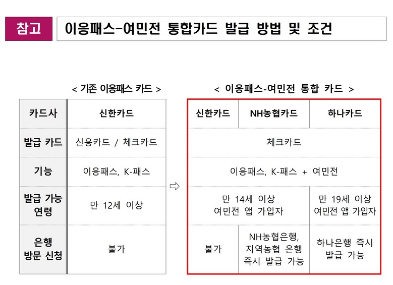 통합카드를 발급받지 않더라도 기존 이응패스와 여민전 카드는 각각 계속해서 사용할 수 있다.