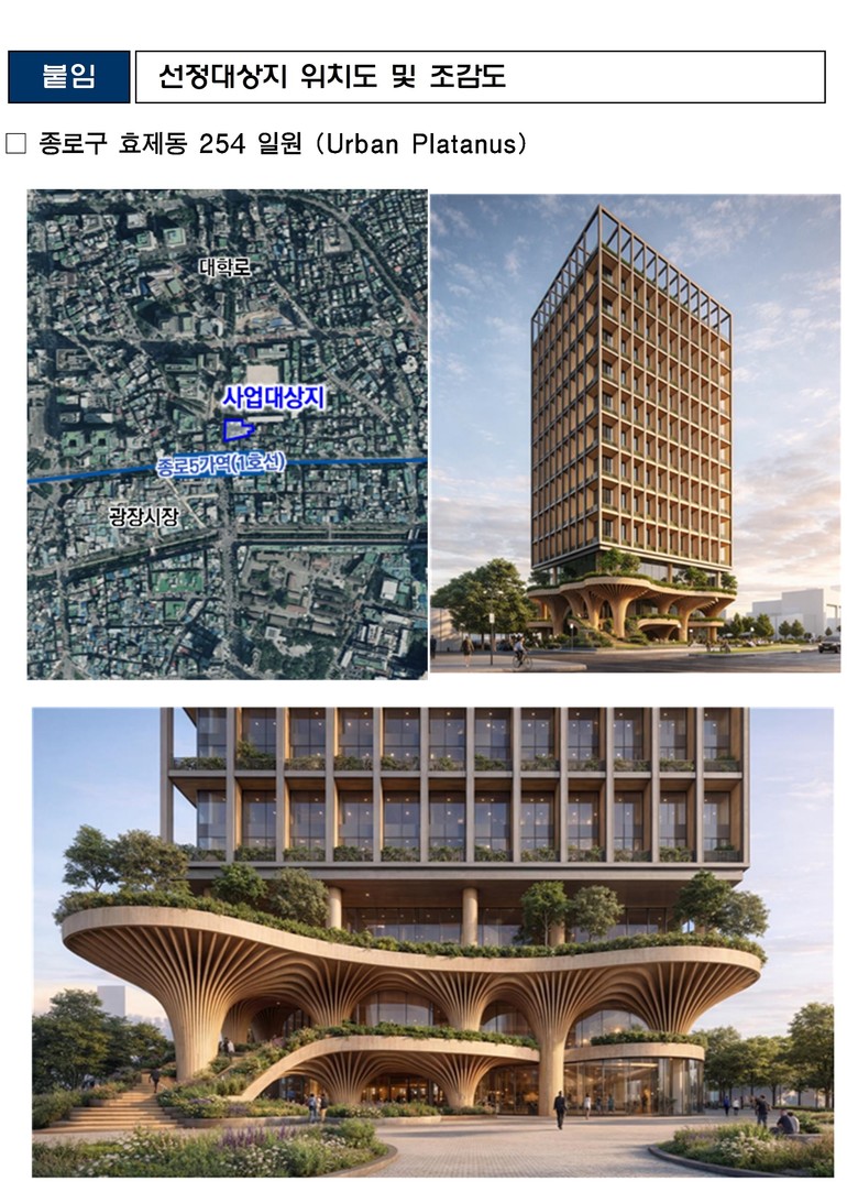 서울시는 종로구 효제동 관광숙박시설 ‘어번 플라타너스(Urban Platanus)’와 서초구 양재동 복합개발사업 ‘네오플랫폼(Neo-Platform)’이 ‘도시건축디자인 혁신사업’ 추가 대상지로 선정됐다고 밝혔다.