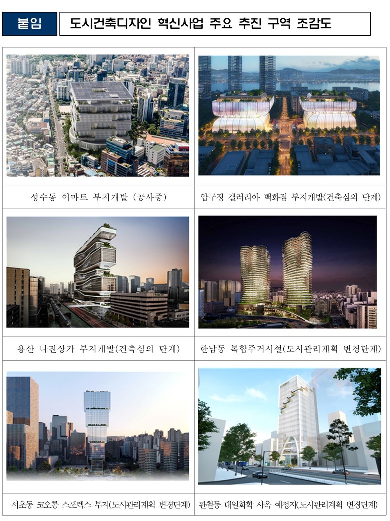 ‘성냥갑 아파트 퇴출 2.0’으로 불리는 ‘도시건축디자인 혁신사업’은 창의적이고 혁신적인 건축디자인을 적용하는 건축물에 용적률·건폐율 완화, 신속 행정 지원, 사업추진 자문 등 혜택을 주는 사업이다.