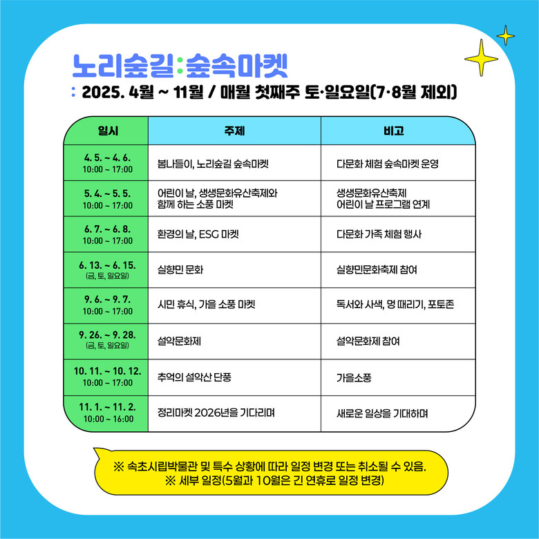 2025년 첫 숲속마켓은 4월 5일(토)부터 6일(일)까지 이틀간 열리며 이후 11월까지 매달 첫째 주 토요일과 일요일에 운영한다. 단, 7, 8월은 열리지 않으며, 6월과 9월은 각각 실향민문화축제·설악문화제와 연계하여 3일간 개최되고, 5월과 10월은 연휴 기간을 반영하여 일정이 조정되어 올해는 총 8회, 18일간 운영될 예정이다.