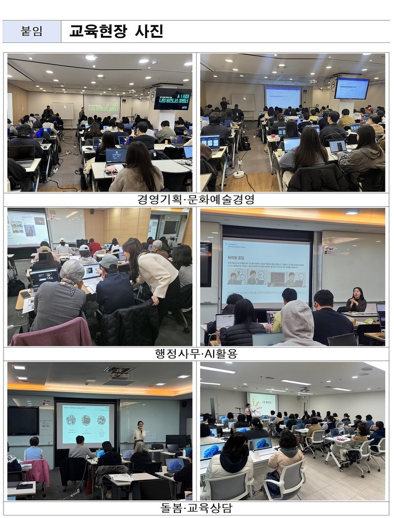 시는 이러한 흐름에 발맞춰, 이번 AI 실습을 직무 분야별 특성에 맞춘 실전 중심으로 운영했다. 교육은 경영기획, 문화예술, 행정사무, AI활용, 돌봄, 교육·상담 등 6개 분야로 나뉘어 현장 밀착형으로 진행됐다.