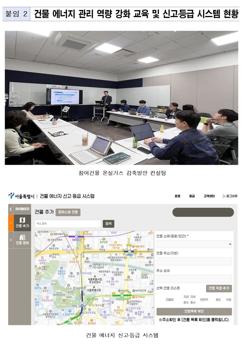 한편 서울시는 중앙부처와 지속적으로 협의해 기후동행건물 프로젝트(신고·등급·총량제)의 원활한 추진을 위한 법·제도적 근거를 마련할 계획이며, 개정 시 제도 추진 속도를 높일 수 있을 것으로 전망한다.