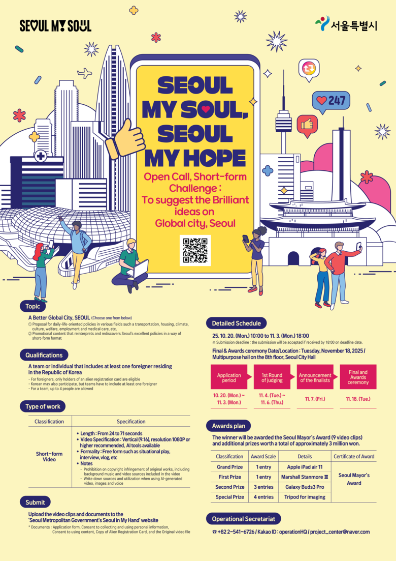 - 시, “숏폼이라는 대중적인 콘텐츠를 통해 글로벌 서울을 위한 외국인들의 아이디어 적극 발굴할 것” [서울 세계타임즈=이장성 기자] 24초 이상 71초 이내 짧은 영상(이하 숏폼)으로 더 나은 글로벌 도시 서울을 만들 기회가 주어진다. 서울시는 오는 10월 20일(월)부터 11월 3일(월)까지 대한민국 거주 외국인을 대상으로 하는 ‘글로벌 서울 아이디어 제안 숏폼 챌린지’를 개최한다고 밝혔다.