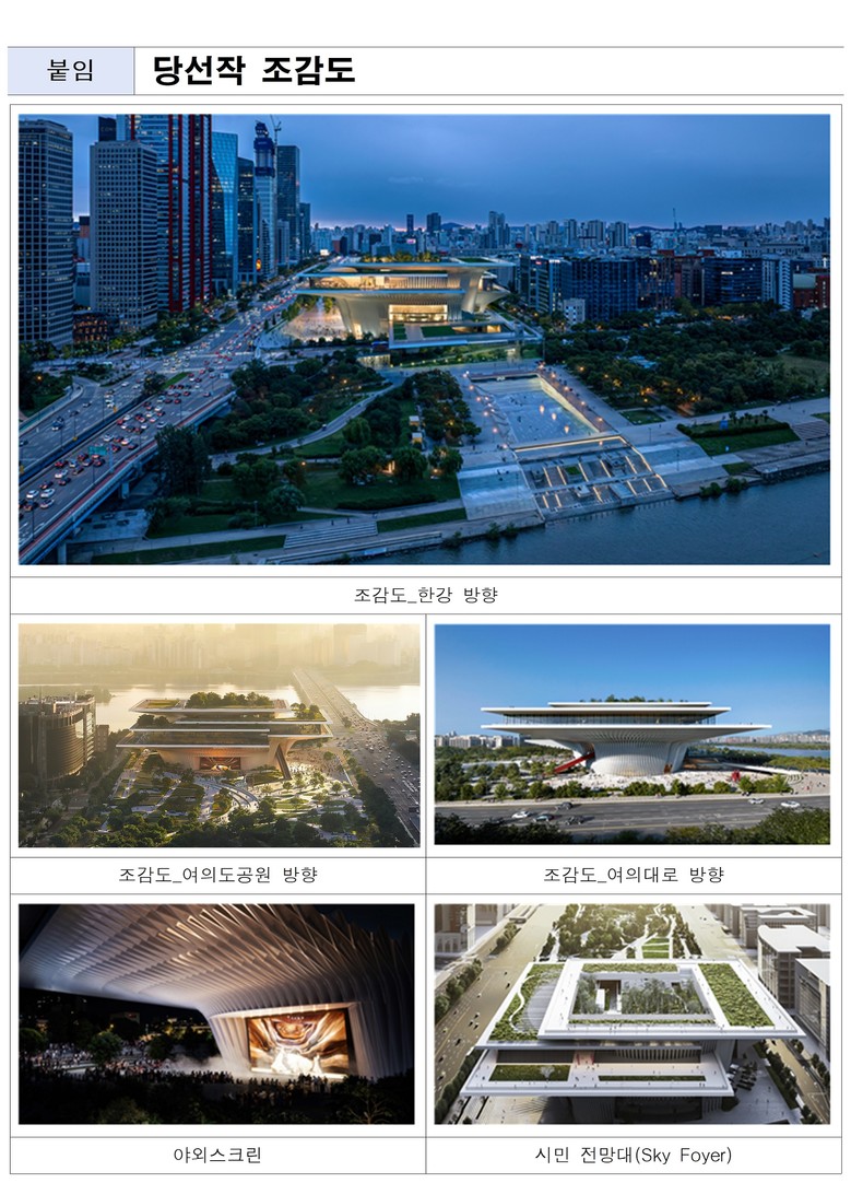 이번 설계공모 심사에서는 서울의 수변 문화 중심지로서의 상징성과 여의도공원 및 한강과의 연계성, 시민에게 열린 공간으로서의 공공성 등을 중점적으로 평가했다.