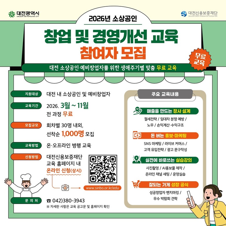 - 인공지능(AI) 홍보물 제작․마케팅 실습 등 현장 적용 과정 대폭 확대 - [대전 세계타임즈=이채봉 기자] 대전시는 예비창업자와 소상공인의 경영 역량 강화를 위해 ‘2026년 창업 및 경영개선 교육’참여자를 모집한다.