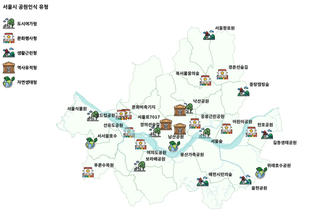 이번 시민 인식 데이터를 종합 분석한 결과 서울 공원은 ▴도시여가형 ▴문화행사형 ▴역사유적형 ▴자연생태형 ▴생활근린형, 5가지 유형으로 구분할 수 있으며, 이들 유형에 따라 시민 인식과 기대하는 기능이 다른 것으로 분석됐다.