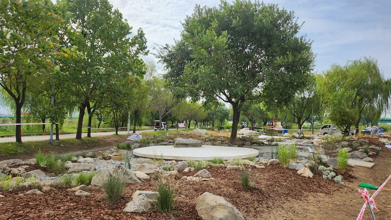 낙동강의 기존 왕버들·능수버들을 배경으로, 선을 형상화한 인공 구조물을 설치했으며, 그 사이에 하천에서 잘 자라는 억새, 수크렁 등 초화류 1,600본과 용버들, 나무수국 등 수목 105주를 식재해 자연과 예술이 조화를 이루는 정원을 연출했다. 특히 정원 한가운데 자리한 큰 버드나무 아래에는 ‘겸재 라운지’가 마련되어 있어, 잠시 쉬어가며 마치 산수화 속에 들어온 듯한 풍경을 감상할 수 있다.