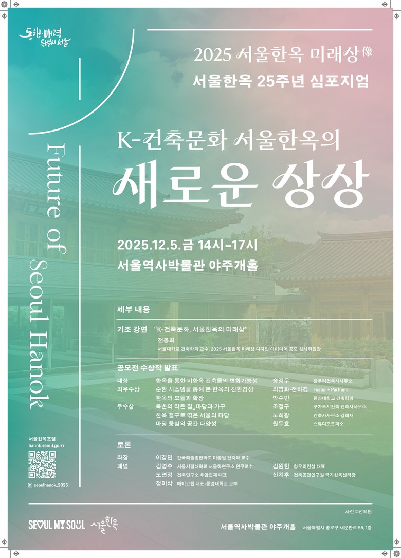 이번 심포지엄에서는 서울시의 지난 25년간 한옥 정책의 주요 성과를 돌아보고 전봉희 서울대 교수가 ‘K-건축문화 서울한옥의 미래상’을 주제로 한옥이 나아갈 방향을 제시하는 기조강연을 한다.