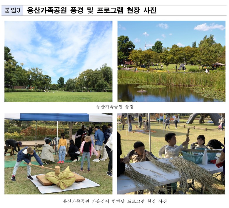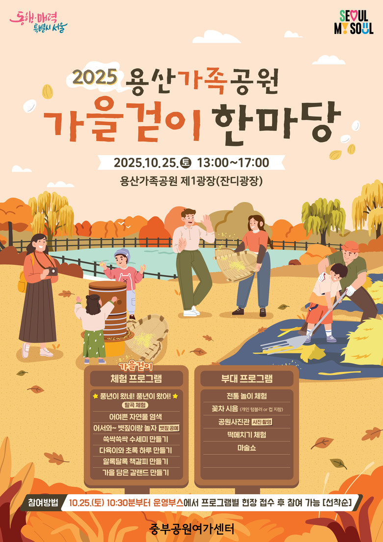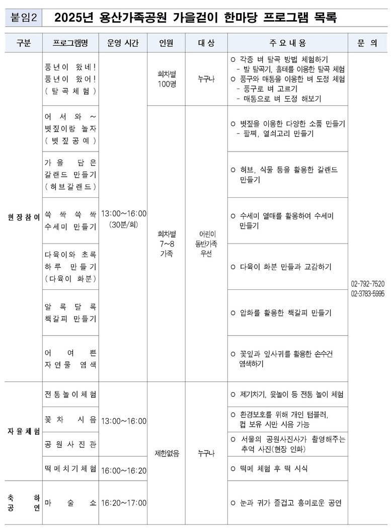「2025 용산가족공원 가을걷이 한마당」에 관한 자세한 사항은 ‘정원도시서울(https://parks.seoul.go.kr)’과‘서울시공공서비스예약(https://yeyak.seoul.go.kr)’ 누리집을 통해 확인할 수 있으며 문의는02-792-7520(용산가족공원 프로그램실) / 02-3783-5995(중부공원여가센터 공원여가과)로 하면 된다.