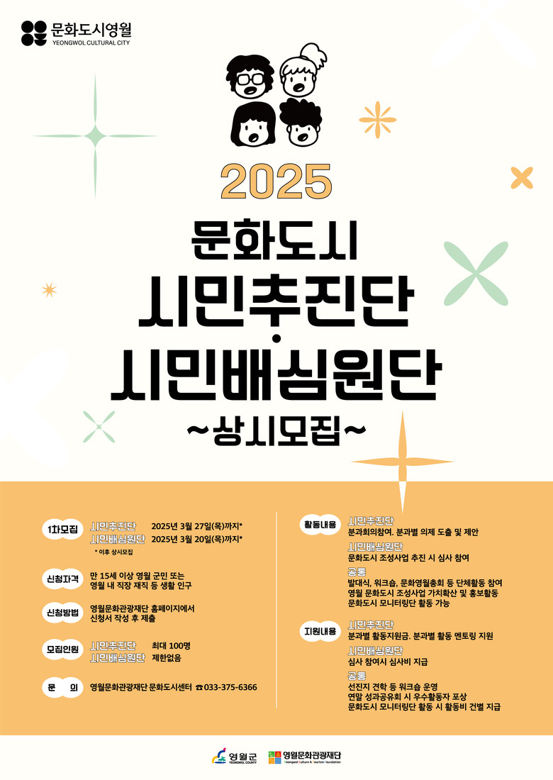 3월 3일부터 진행하는 1차 접수는 시민배심원단은 22일, 시민추진단은 27일까지 진행하며 이후에도 연중 접수한다. 자세한 내용은 영월문화관광재단 누리집 모집 공고를 참고하거나 영월문화관광재단 문화도시센터(033)375-6366)으로 문의하면 된다.