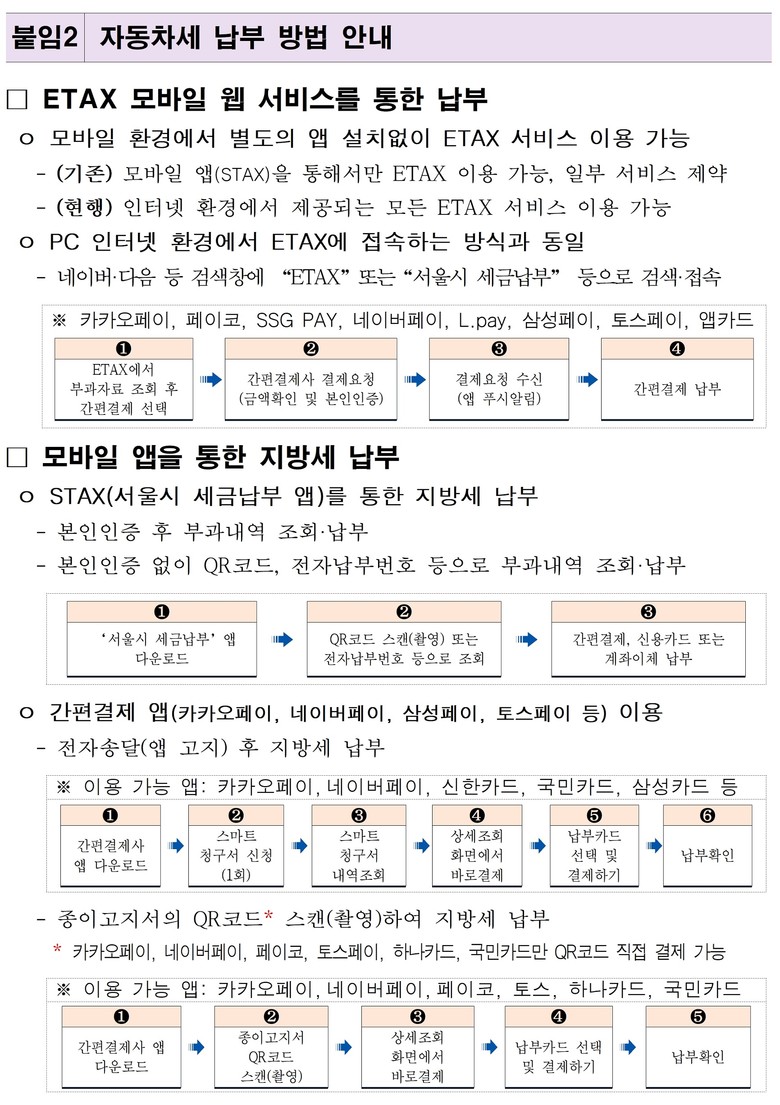 한편 서울시는 납세자가 자동차세를 납부 기한 내에 편리하게 납부할 수 있도록 ▴서울시 지방세 인터넷 납부시스템(ETAX) ▴모바일 앱(서울시 STAX) ▴카카오페이.네이버페이.토스페이 등 간편결제사 앱 등 다양한 납부 편의 서비스를 제공 중이다.