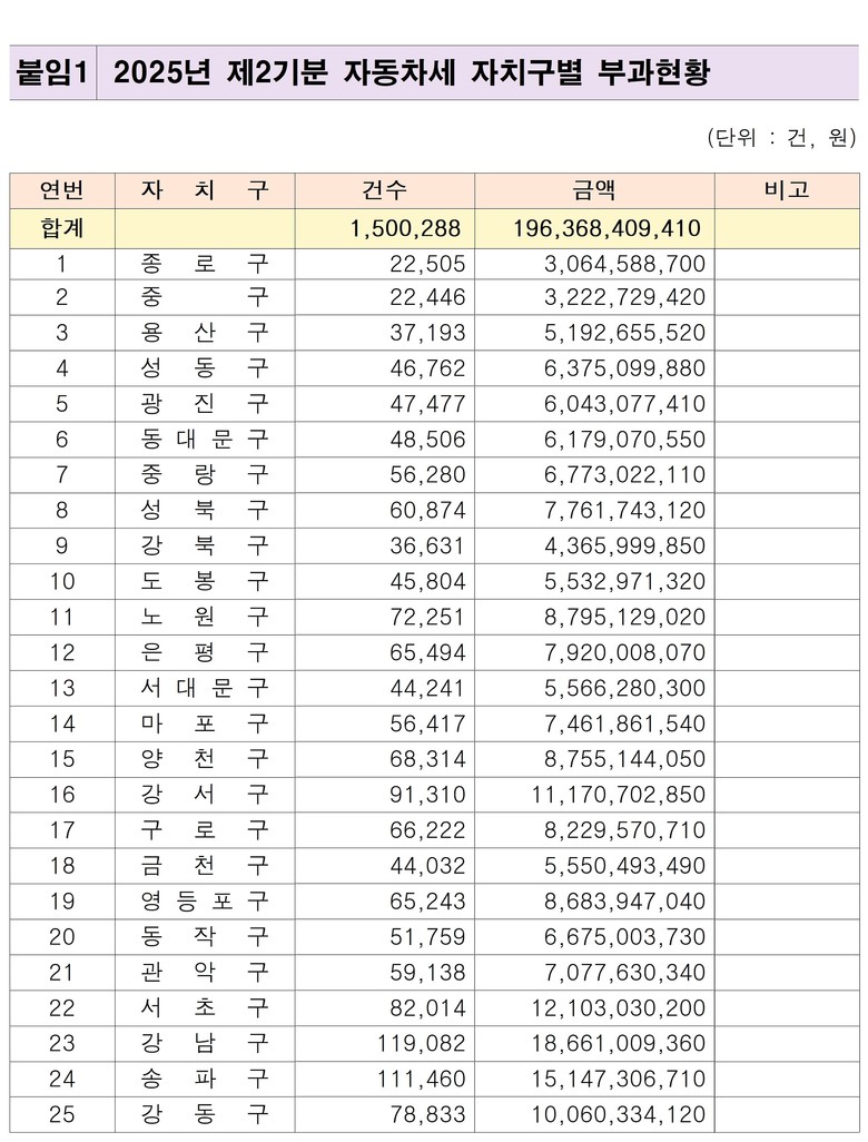[서울 세계타임즈=이장성 기자] 서울시는 2025년도 제2기분 자동차세 1,964억 원의 세액을 확정하고 150만 건의 고지서를 일제히 발송했으며, 12월 16일부터 31일까지를 납부기간으로 운영한다고 밝혔다.