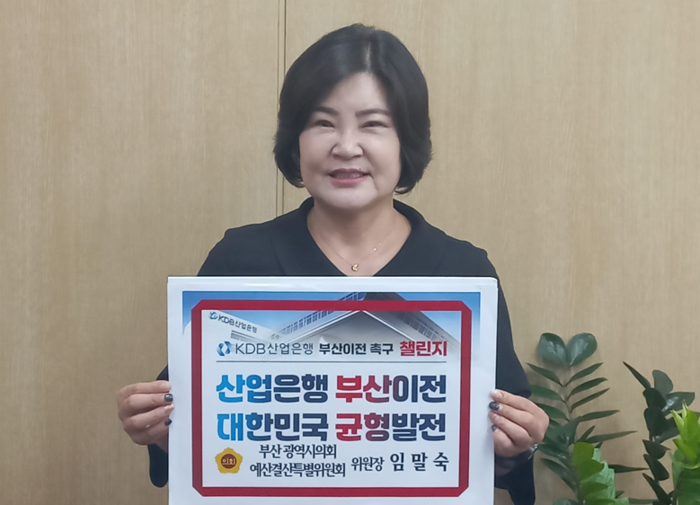 [부산 세계타임즈=이용우 기자] 부산시의회 임말숙 예산결산특별위원장이 최근 '산업은행 부산이전 촉구 챌린지'에 동참했다.