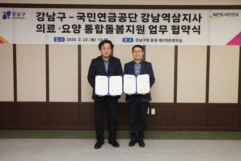 [강남구 세계타임즈=이장성 기자] 꿈이 모이는 도시, 미래를 그리는 강남구(구청장 조성명)가 2월 23일 구청에서 국민연금공단 강남역삼지사(지사장 신의철)와 ‘의료·요양 통합돌봄사업의 원활한 추진을 위한 업무협약(MOU)’을 체결했다.