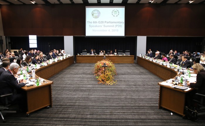문 의장은 이어 "상호긴밀히 연계된 국제 분업체계 속에서 자유롭고 공정한 무역의 원칙을 저버린다면, 협력을 통한 상생번영의 토대를 유지할 수 없다. 어려울수록 근본으로 돌아가야 한다”면서 "자유무역 규범의 가치에 대한 G20 의회의 신뢰와 지지가 필요하다”고 호소했다.