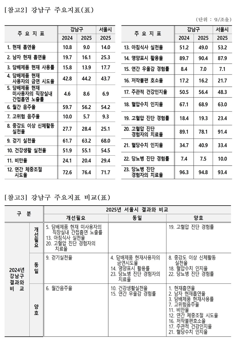 지역사회건강조사는 전국 시·군·구를 대상으로 흡연, 신체활동, 식생활 등 주요 건강지표를 조사해 지역 보건정책 수립의 기초 자료로 활용하는 국가 단위 조사다. 구는 지난해 5월 16일부터 7월 31일까지 질병관리청, 인제대학교 산학협력단과 함께 만 19세 이상 구민 916명을 대상으로 조사를 진행했다. 조사 결과는 서울시 평균과의 비교, 전년도 강남구 수치와의 비교를 통해 ‘양호·동일·개선 필요’로 구분해 분석했다.