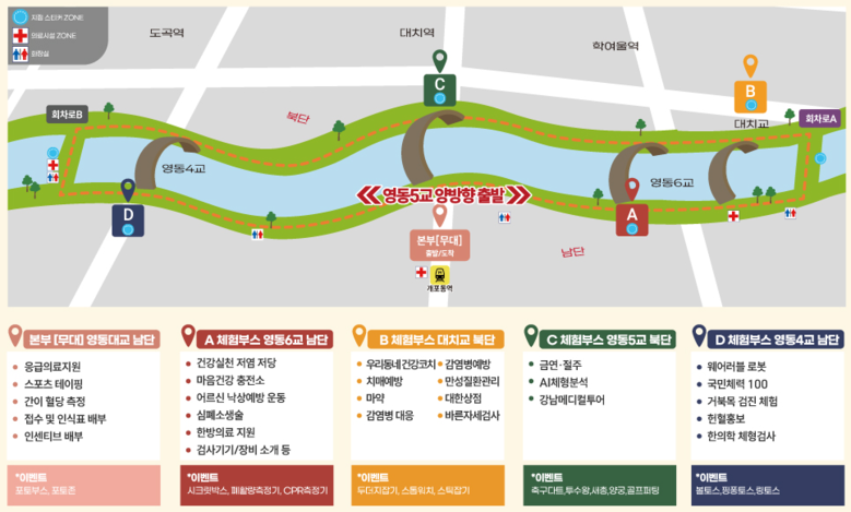 걷기 코스는 영동5교 남단에서 출발해 영동3교와 탄천 합수부 방향 두 경로로 나뉘며, 반환점을 돌아 다시 출발지로 돌아오는 방식이다. 참가자는 코스 곳곳에 설치된 4곳의 건강 체험 부스를 방문하며 6개의 건강 스탬프를 받을 수 있고, 완주자에게는 인센티브를 제공한다.