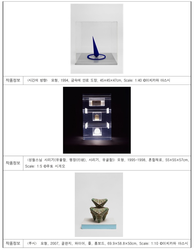 ○ [아카이브] - 마지막 소주제는 최재은의 작업 세계가 형성되고 확장된 과정을 모형과 문헌 아카이브를 통해 통합적으로 조망한다.〈재생조형관(Recycle Art Pavilion)〉,〈루시(Lucy)〉, 해인사〈성철스님 사리기(Reliquary of Venerable Seongcheol)〉,〈시간의 방향(Direction of Time)〉, 다실〈즈레(Zure)〉등 주요 프로젝트의 모형은 각 작업의 개념적·구조적 실험을 가시화하며, 작품집과 도록, 평론, 도면, 스케치, 언론 기록 등 문헌 자료는 작가의 작업 전개 과정을 입체적으로 보여준다.