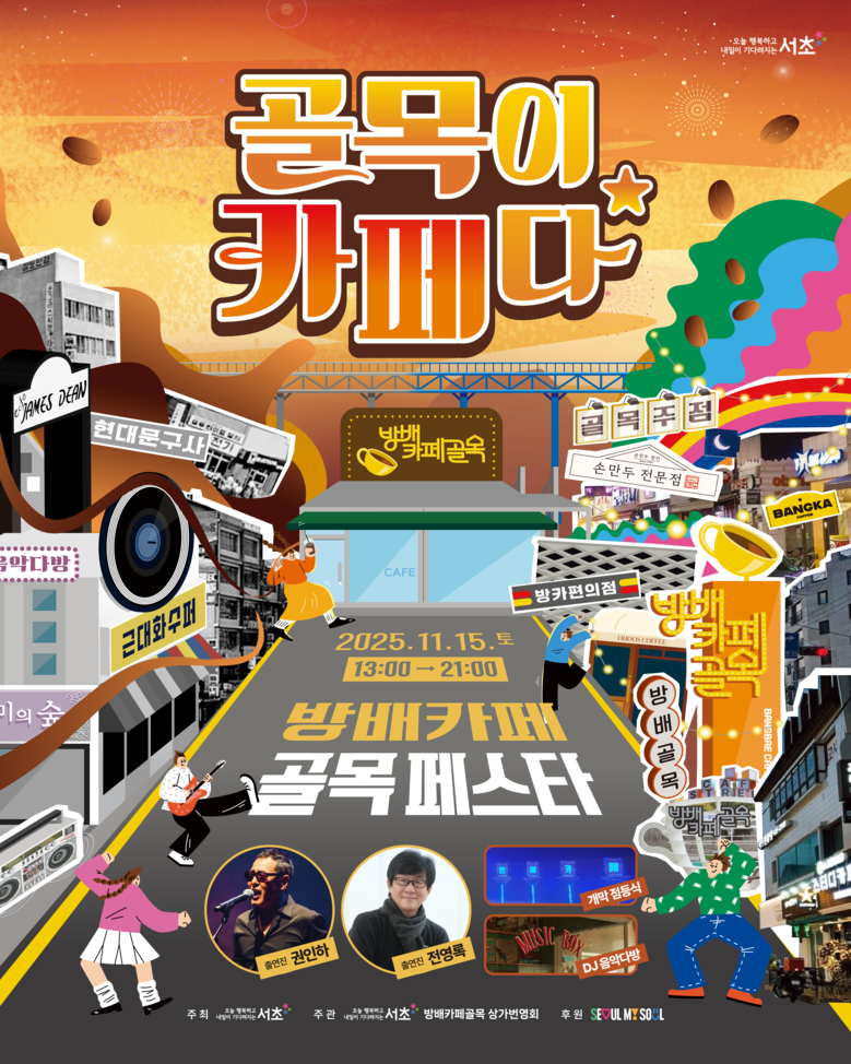 15일 오후 1시부터 9시까지 진행되는 이번 축제는 ‘골목이 카페다!’를 주제로, 방배카페골목 공영주차장부터 사거리까지 약 100m 구간을 ‘차 없는 거리’로 운영한다. 골목 전체를 거대한 카페로 재해석해, 독창적인 공간 연출과 다채로운 프로그램이 펼쳐질 예정이다.