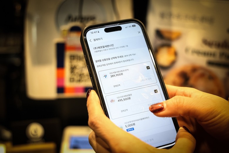 | ▲ 구로구 한 카페에서 주민이 모바일 애플리케이션을 통해 ‘구로사랑상품권’으로 결제하고 있다. |